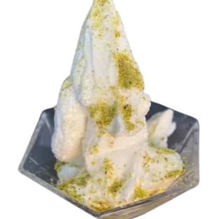 Large triangular pistachio baklava slice served with a scoop of creamy ice cream.