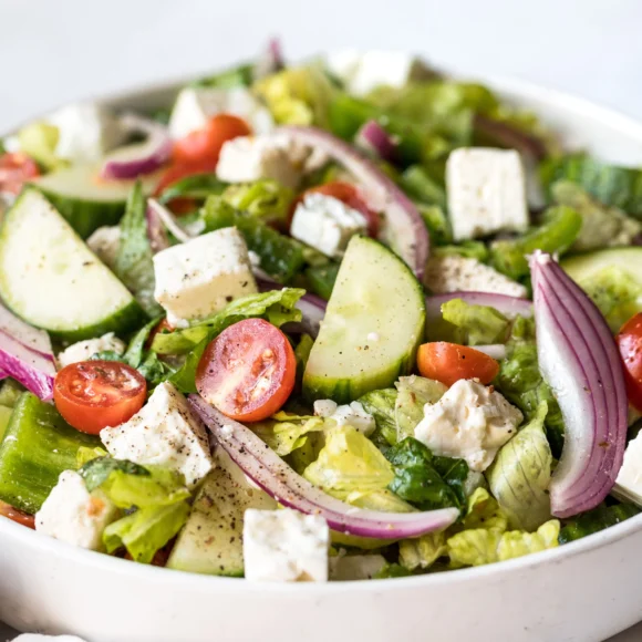 Feta cheese, olives, tomatoes, cucumbers, onions, and oregano in olive oil dressing.