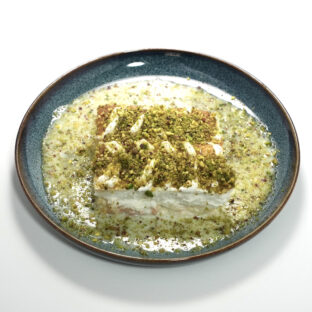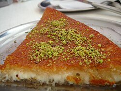 Shredded dough dessert with melted cheese, soaked in sweet syrup and topped with pistachios.