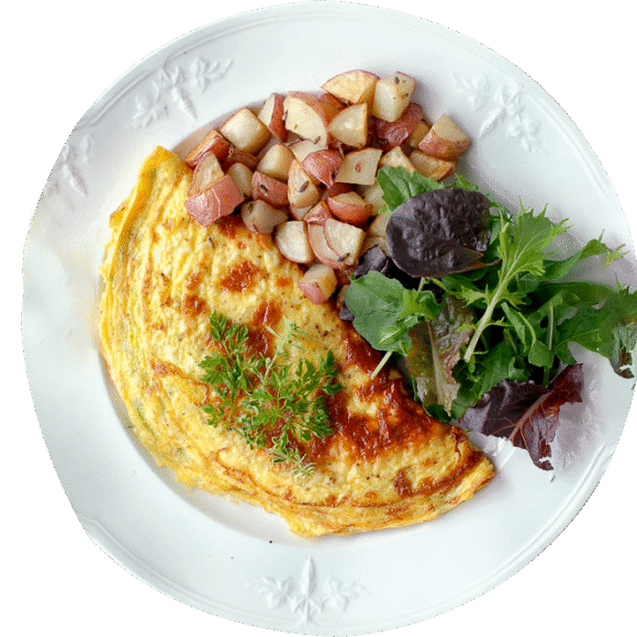 Fluffy omelette filled with fresh vegetables, served with golden breakfast potatoes and toast.